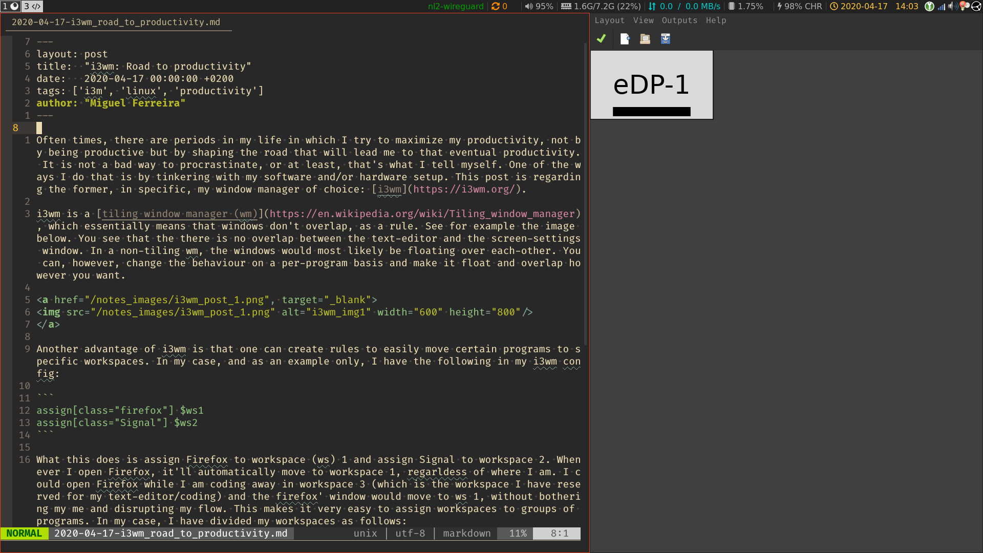 And that’s it for now. On a later post I’ll go through some specific scripts and programs that I use in conjunction with i3 to improve my productivity further. One example of that is in this post.