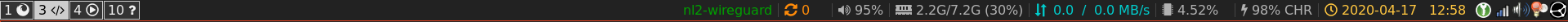 In i3wm, there is no option to minimize to the bar. You could potentially hide a window, but it is not minimized to the bar, it is hidden. Not having the tradional bar reduces visual clutter and, again, improves focus. It’s all about that minimalism framework! I use the bar solely to view important information regarding my machine as well as an helper for noticing workspaces. In the image below, you’ll notice that I have several “blocks” in the right side of the bar, beginning with “nl2-wireguard” and ending with the clock/time.